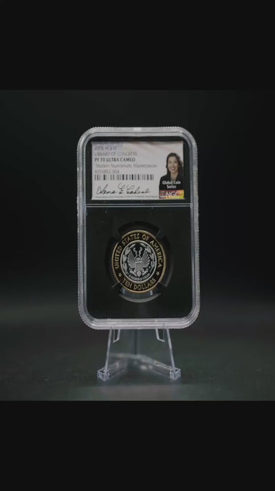 A pinnacle of modern U.S. coinage, the 2000-W $10 Library of Congress, certified PF70 by NGC with the exclusive "Modern Numismatic Masterpieces/Cabral Auto" label, is a collector’s masterpiece. Struck at the West Point Mint with a mintage of just 7,261, this bimetallic proof coin, featuring a gold core and platinum ring, commemorates the 200th anniversary of the Library of Congress. Its flawless proof finish and Anna Escobedo Cabral’s autograph, as the 42nd U.S. Treasurer, elevate its status as a numismatic treasure, blending innovative design, rarity, and historical significance.