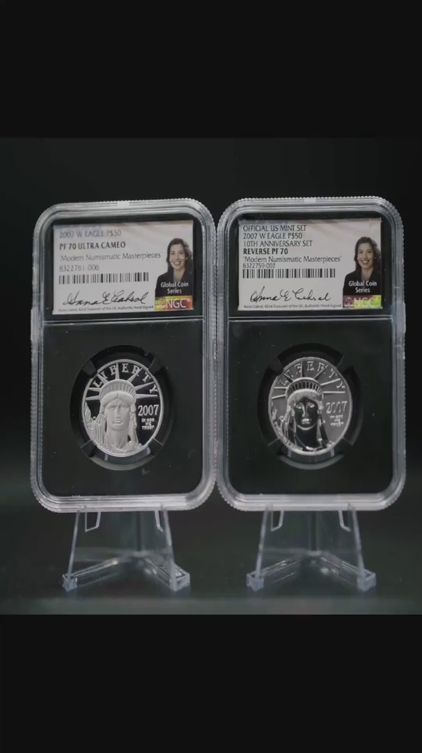 A pinnacle of modern U.S. coinage, the 2007 2PC American Platinum Eagle Set, certified PF70 and Reverse PF70 by NGC with the prestigious "Modern Numismatic Masterpieces" Anna Cabral Autograph label, is a collector’s masterpiece. Struck at the West Point Mint with a mintage of 25,519 sets, this set includes a 1/2 oz Proof $50 and a 1/2 oz Reverse Proof $50 Platinum Eagle, both in flawless condition. Celebrating the 10th anniversary of the Platinum Eagle series with iconic Statue of Liberty and eagle designs, its pristine finishes, signed by the 42nd U.S. Treasurer, and numismatic significance make it a rare treasure, perfect for collectors seeking artistry, history, and exclusivity.