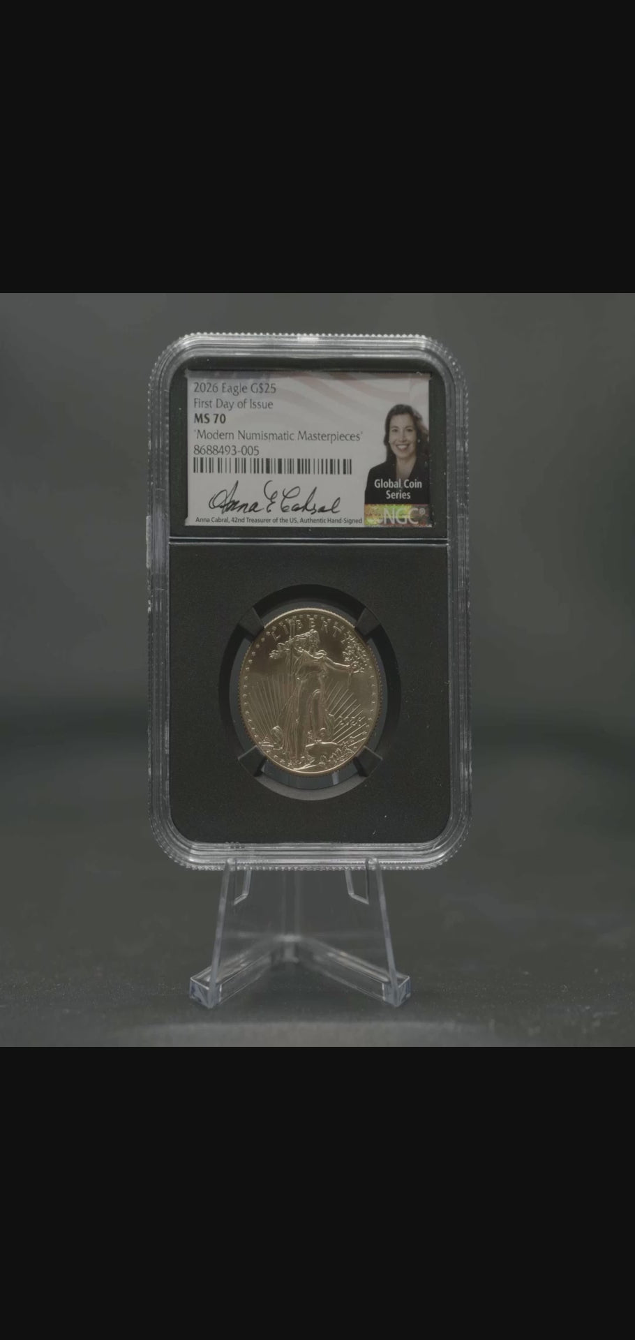 The 2026 $25 American Gold Eagle in NGC MS70 First Day of Issue, hand-signed by Anna Escobedo Cabral with the exclusive Modern Numismatic Masterpieces label, embodies dual landmark anniversaries: the series' 40th and America's 250th. This impeccable early-release specimen, enriched by the autograph of the 42nd Treasurer of the United States, transcends ordinary bullion to achieve true modern classic status. Its blend of flawless execution, anniversary timing, and Treasury attribution secures its place as a standout for Gold Eagle registry competitors and a cherished cornerstone in sophisticated collections.