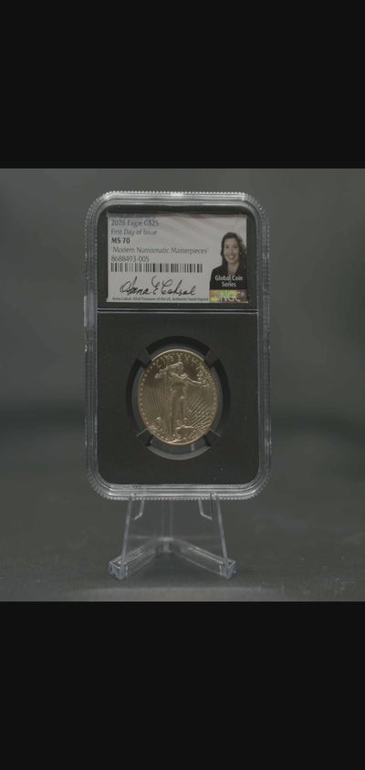 The 2026 American Gold Eagle honors four decades of the iconic series that began in 1986, long established as the benchmark for government-backed gold bullion worldwide. This extraordinary year layers the program's ruby anniversary with the nation's 250th, creating a resonant dual commemoration. The Type 2 design refinements—Jennie Norris' dramatic eagle reverse paired with Saint-Gaudens' legendary Liberty—continue to captivate with enhanced realism and depth. First Day of Issue status guarantees an example from the very earliest strikes, often delivering the strongest visual impact. Anna Escobedo Cabral's autograph on the exclusive Modern Numismatic Masterpieces label—available only through limited signing sessions—adds a layer of historical authenticity rarely seen on modern issues, appealing directly to label collectors and provenance hunters.